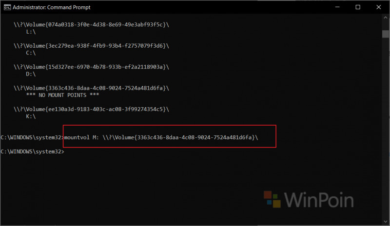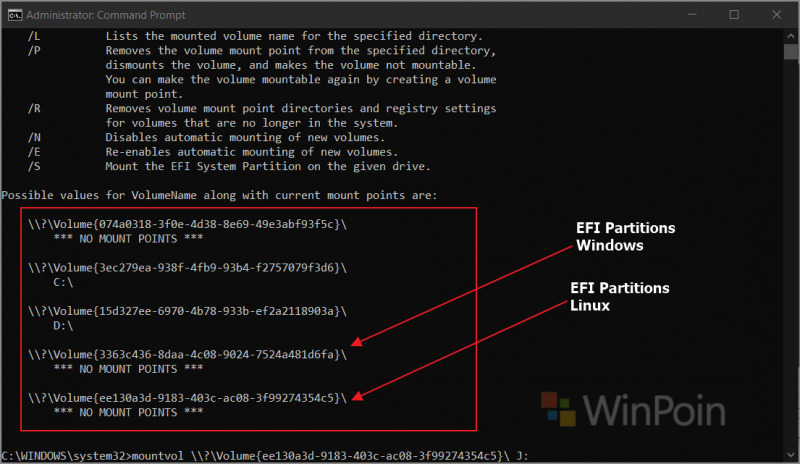 Karena ketika instalasi Linux saya membuat EFI Partitions kedua maka langkah yang paling efektif adalah dengan beberapa langkah berikut. Langkah 1. Pertama buka Command Prompt as AdminLangkah 2. Selanjutnya silahkan masukkan perintah mountvol untuk melihat daftar dari volumename yang tersedia di perangkat kamu.Pada gambar diatas, dua paling bawah adalah EFI Partitions untuk Windows 10 dan Linux, untuk melakukan Mounting, cukup masukkan perintah pada langkah ketiga dibawah. Langkah 3. Untuk melakukan Mounting EFI Partitions kamu dapat menggunakan perintah berikut: