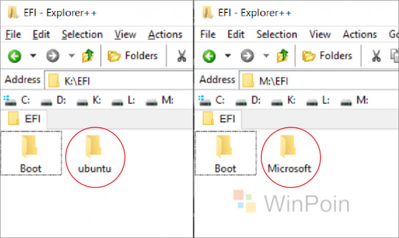 Untuk mengaksesnya, saya lebih suka menggunakan Explore++ yang dapat kamu download pada halaman berikut. Selanjutnya silahkan buka Explorer++ dan jalankan sebagai Administrator.Silahkan saja buka seperti biasa. Didalam masing masing EFI Partition harusnya akan ada Folder EFI.Nah lalu didalamnya lagi ada folder Boot dan Microsoft/ubuntu tergantung dari EFI Partitions mana yang kamu buka.Sekedar catatan, jika kamu menggunakan Dualboot Linux dan Windows di EFI Folder tersebut akan ada dua yaitu Microsoft dan ubuntu (misalnya), jadi pemilihan OS akan dilakukan tanpa melalui BIOS, jika keduanya dipisah seperti yang saya lakukan diatas, pemilihan OS harus melalui BIOS dulu, berikut contohnya.Seperti gambar diatas, saya harus memilih OS melalui BIOS (karena seperti yang sudah saya jelaskan diatas, Bootloader Windows 10 dan Linux saya pisahkan dalam dua Partisi di dua SSD berbeda.Sedangkan seperti pada gambar diatas, ini adalah pemilihan Boot default yang mana hampir seluruh pengguna Dual boot melihatnya, ketika Boot, mereka tidak harus memilih OS melalui BIOS namun akan diberikan pilihan setelah proses POS. Ini terjadi karena baik folder Ubuntu/ Microsoft dalam satu folder EFI yang sama.